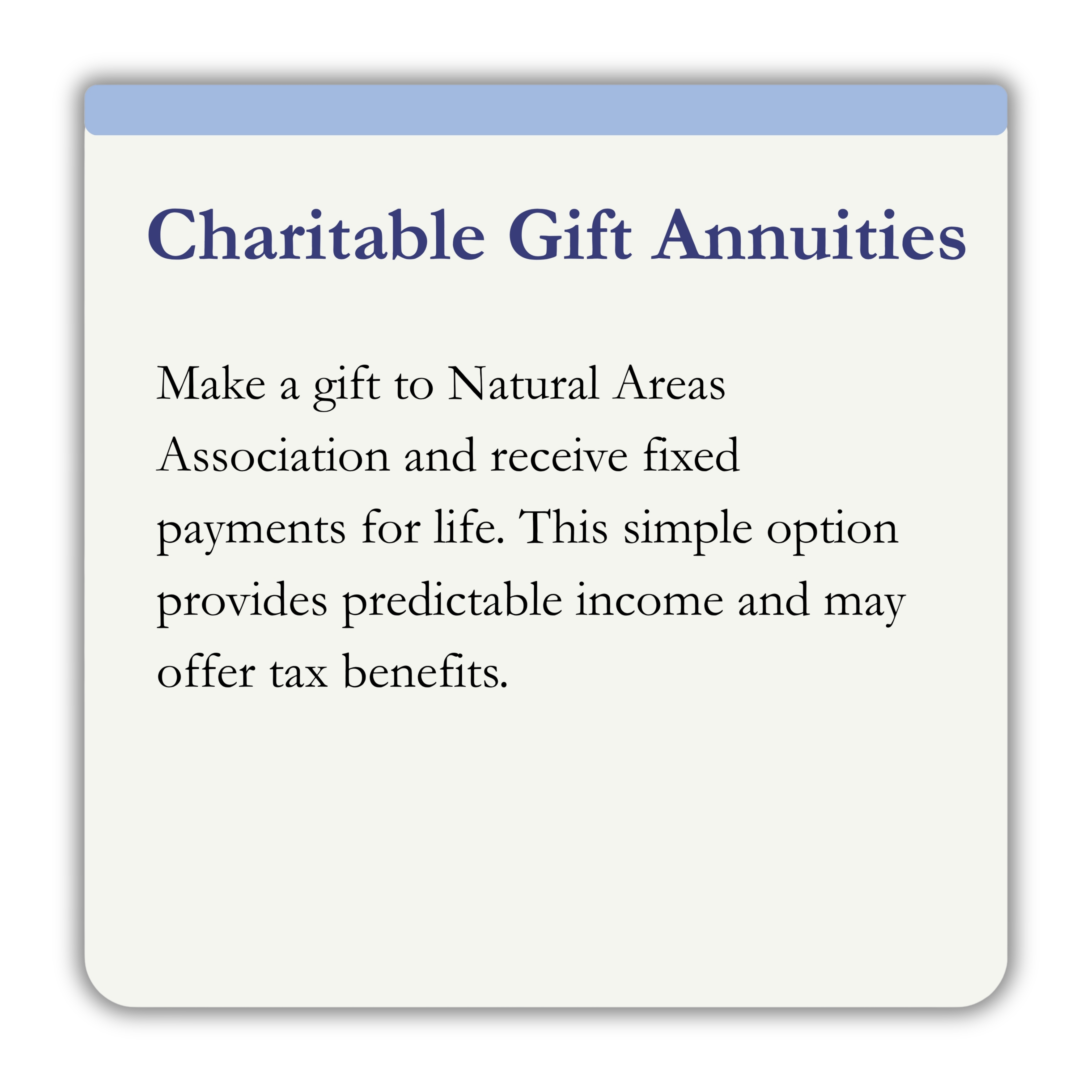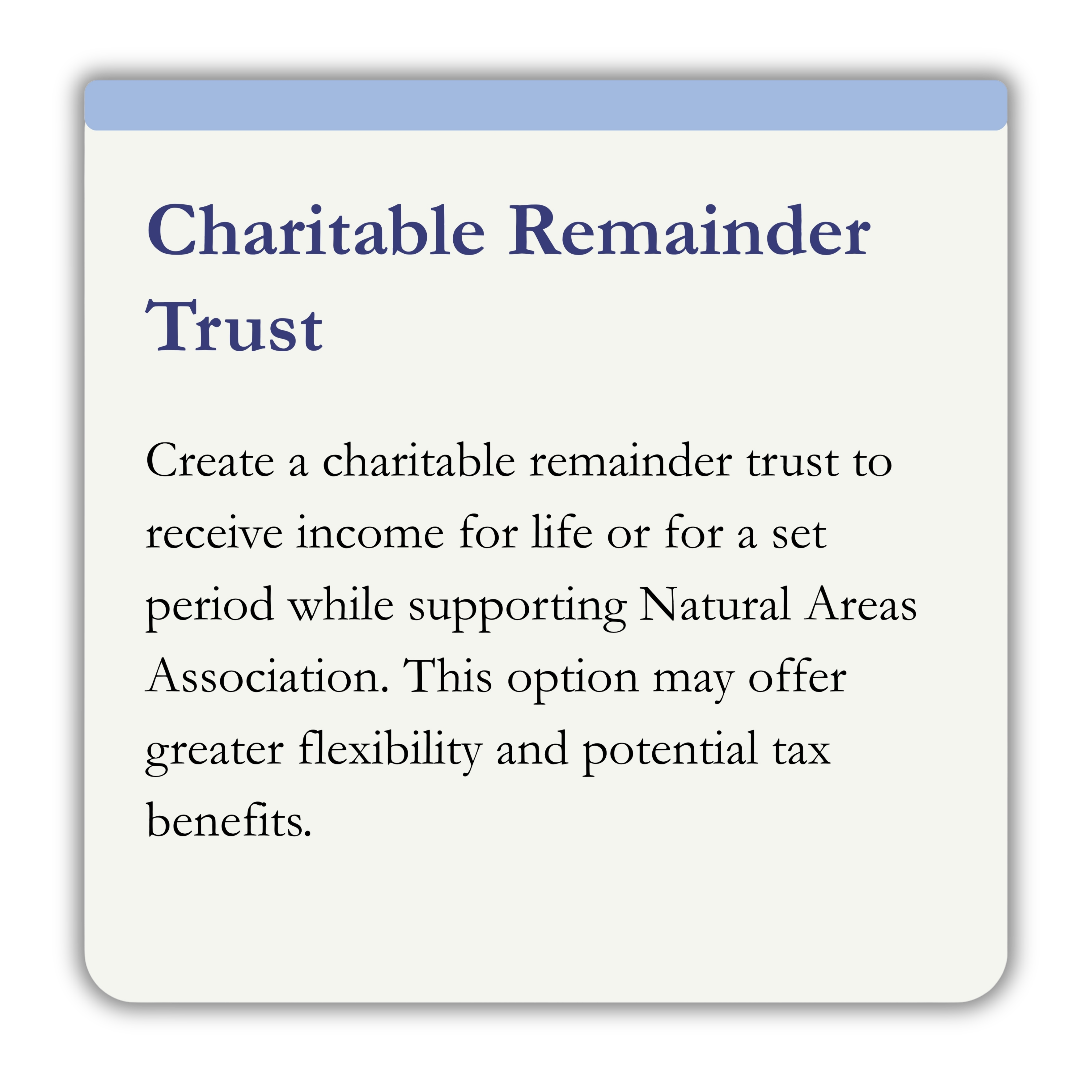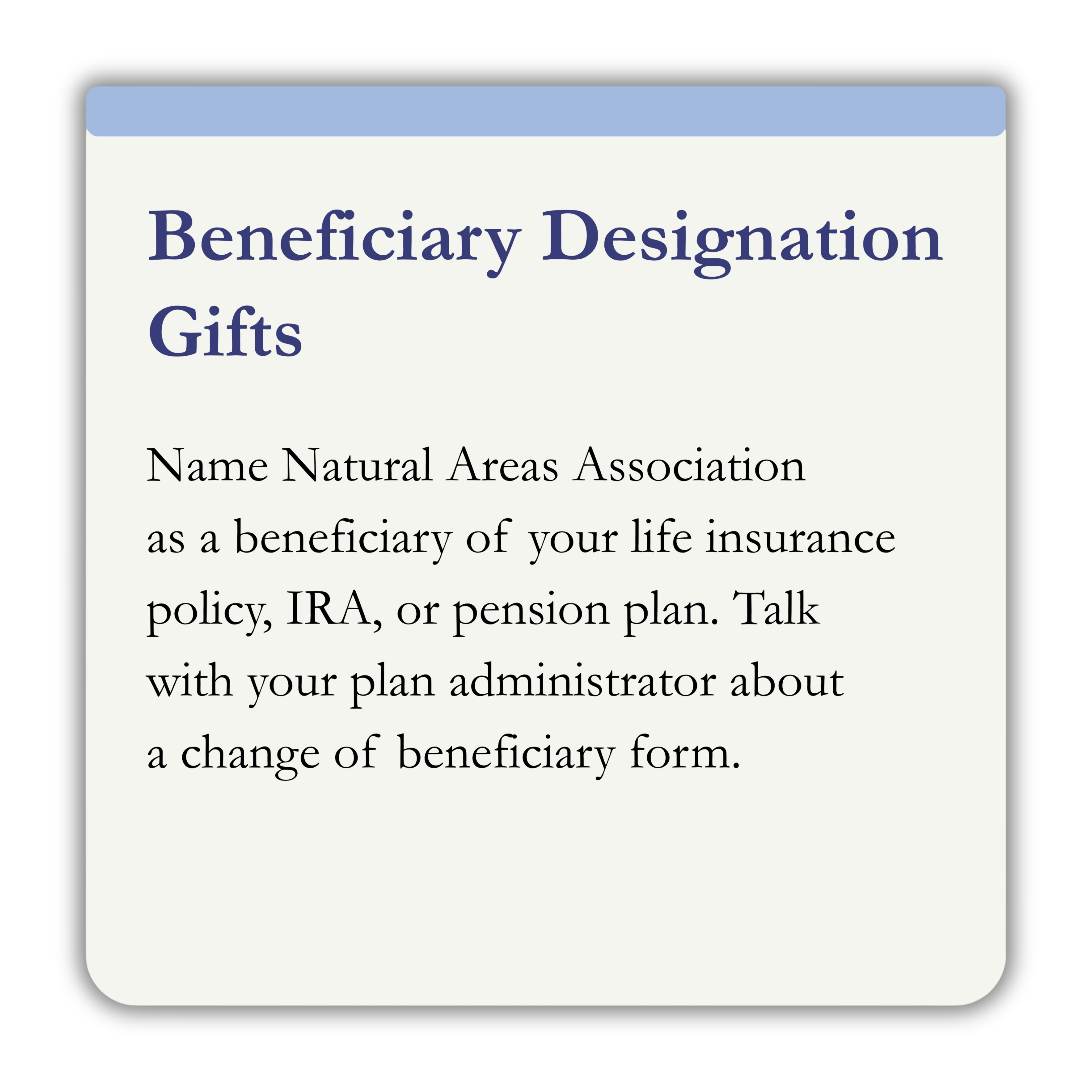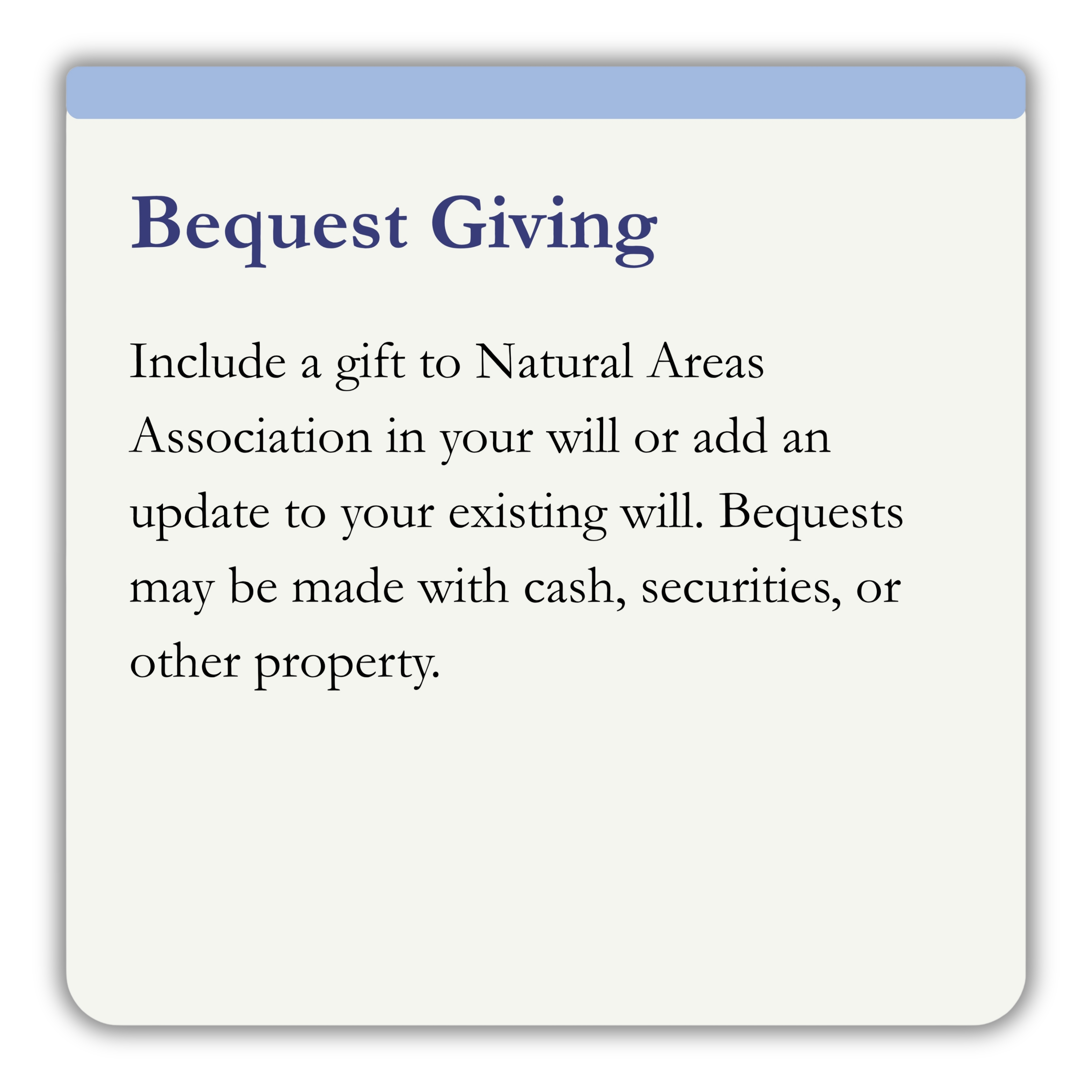 There are several ways to structure a planned gift. Common options include naming Natural Areas Association in a will or trust, naming the organization as a beneficiary of a retirement account or life insurance policy, or donating appreciated assets.